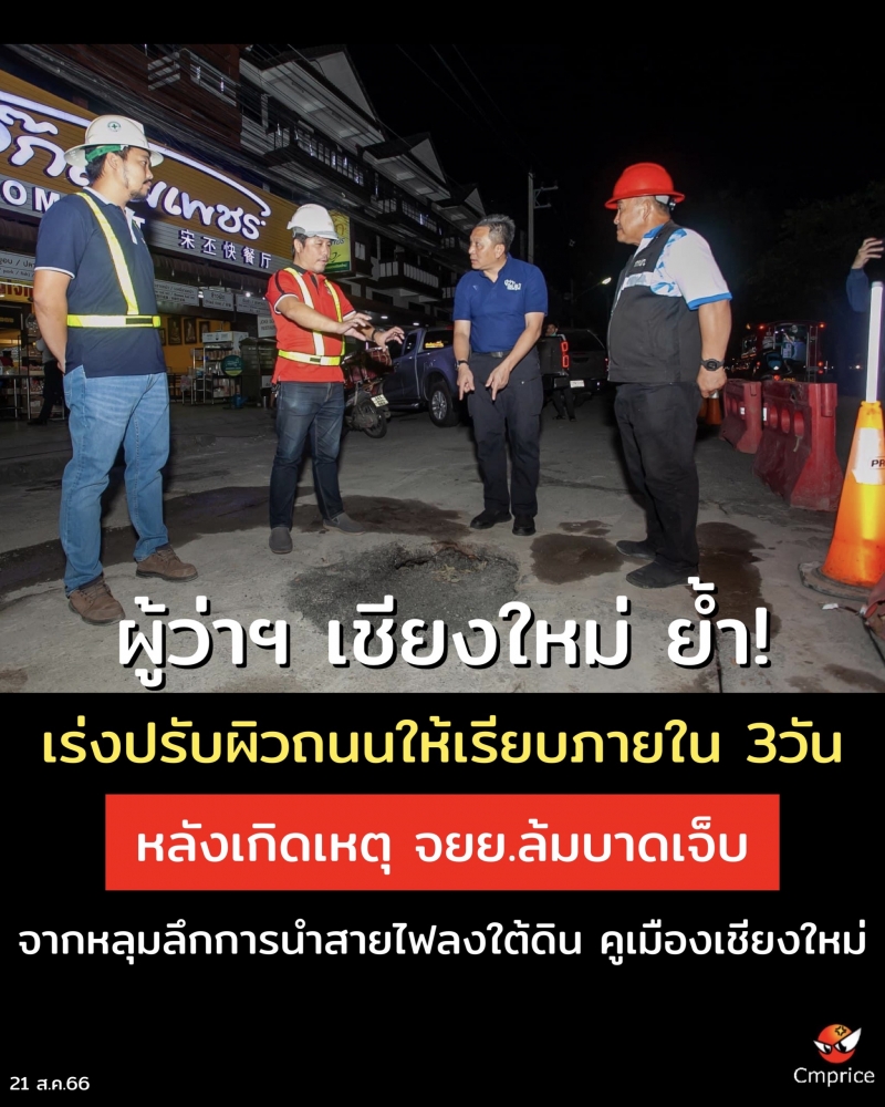 ผู้ว่าราชการจังหวัดเชียงใหม่ ลงพื้นที่ตรวจสอบจุดเกิดเหตุ หลุมลึกจากงานนำสายไฟลงใต้ดิน บริเวณคูเมืองเชียงใหม่ จนทำให้รถมอเตอร์ไซด์ล้มได้รับบาดเจ็บ พร้อมเน้นย้ำให้เร่งดำเนินการปรับพื้นผิวให้เรียบภายใน 3 วัน