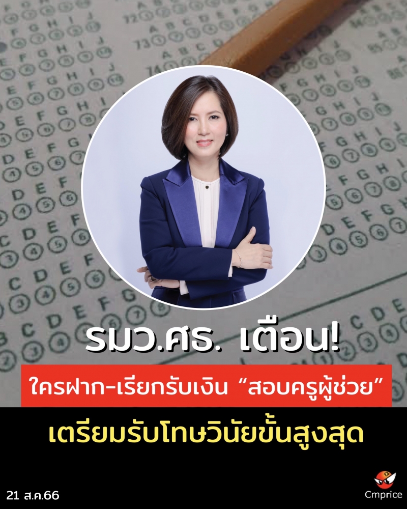 | • รมว.ศธ. เตือน! ใครฝาก-เรียกรับเงิน สอบครูผู้ช่วย เตรียมรับโทษวินัยขั้นสูงสุด ระบุใครพบเรื่อง ร้องเรียนได้โดยตรง พร้อมจัดการทันที |