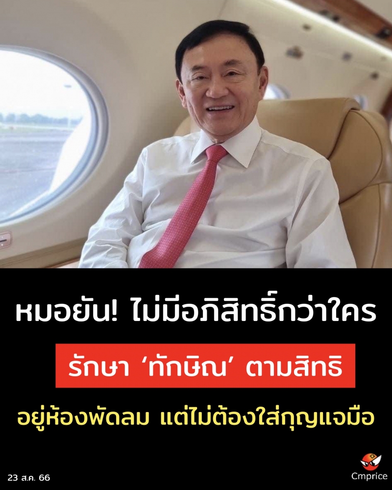 | • หมอใหญ่รพ.ตำรวจ ยันรักษา ทักษิณ ตามสิทธิ ไม่มีอภิสิทธิ์กว่าใคร อยู่ห้องพัดลม แต่ไม่ต้องใส่กุญแจมือ อาการดีขึ้นแต่ยังเหนื่อยหอบ สั่งงดเยี่ยมทุกกรณี |
