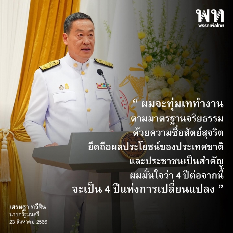 ผม นายเศรษฐา ทวีสิน จะขอทำหน้าที่นายกรัฐมนตรีที่ไม่รู้จักคำว่าเหน็ดเหนื่อย เป็นรัฐบาลที่จะทุ่มเท ทำงานหนัก รับฟังเสียงของประชาชน นำความสามัคคีกลับคืนสู่คนในชาติ นำพาประเทศไทยไปข้างหน้า และสร้างอนาคตที่ดีกว่าให้กับลูกหลานของพวกเราทุกคน นับจากวันนี้เป็นต้นไป