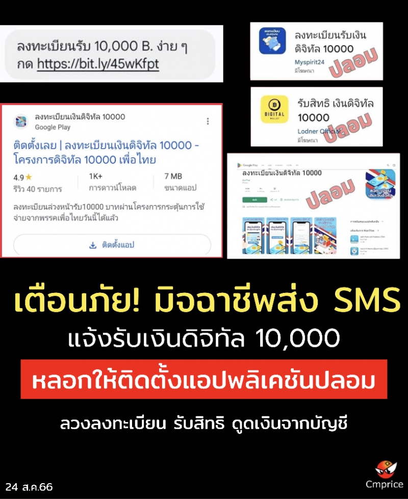 | • เตือนภัย! มิจฉาชีพส่ง SMS แจ้งรับ เงินดิจิทัล 10,000 หลอกให้ติดตั้งแอปพลิเคชันปลอม ลวงลงทะเบียน รับสิทธิ กลโกงควบคุมโทรศัพท์ดูดเงินจากบัญชี |