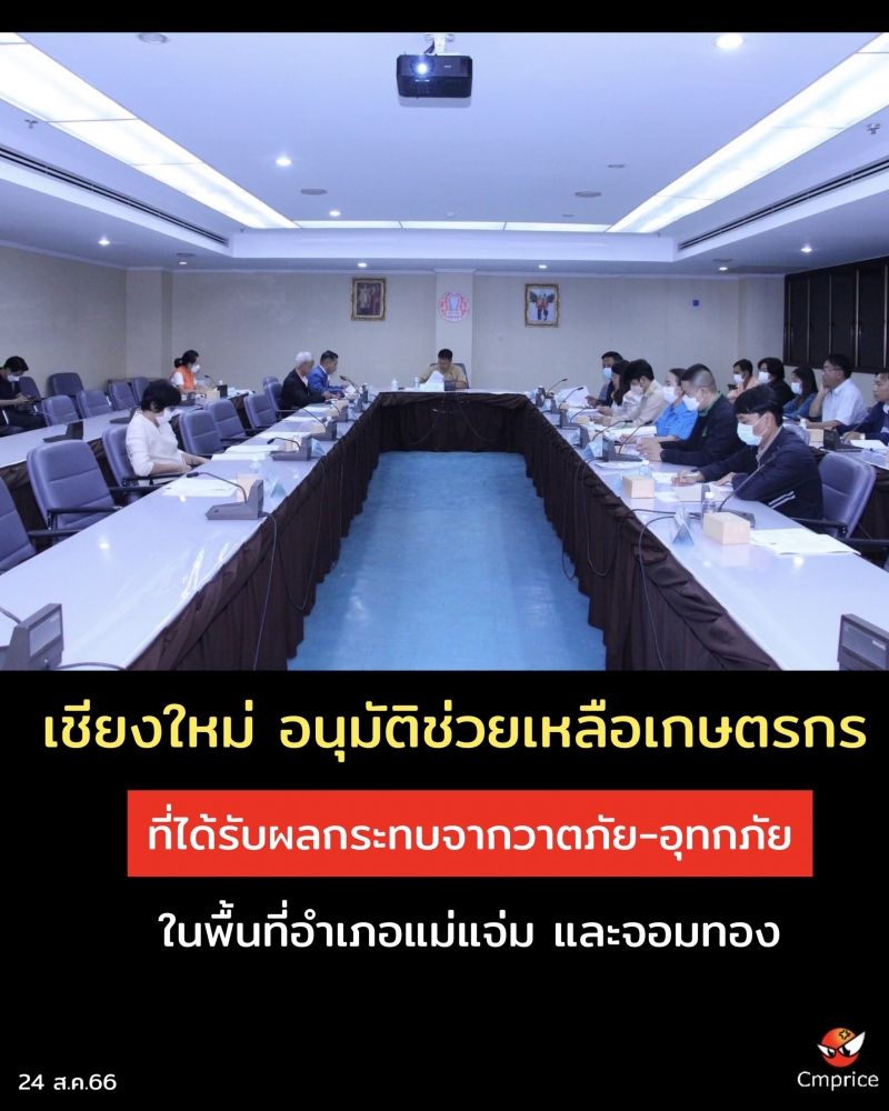 วันนี้ (24 ส.ค. 66) ที่ ห้องประชุม 1 ขั้น 2 อาคารอำนวยการ ศาลากลางจังหวัดเชียงใหม่ นายนิรัตน์ พงษ์สิทธิถาวร ผู้ว่าราชการจังหวัดเชียงใหม่ มอบหมายให้ นายชัชวาลย์ ปัญญา รองผู้ว่าราชการจังหวัดเชียงใหม่ เป็นประธานประชุมคณะกรรมการให้ความช่วยเหลือผู้ประสบภัยพิบัติจังหวัดเชียงใหม่ (ก.ช.ภ.จ.เชียงใหม่) ครั้งที่ 7/2566 เพื่อพิจารณาให้ความช่วยเหลือ ภายหลังจังหวัดเชียงใหม่ได้เกิดเหตุวาตภัยในห้วงเดือนมีนาคม-พฤษภาคม 2566 ทำให้มีพื้นที่ได้รับผลกระทบรวม 9 อำเภอ 20 ตำบล 126 หมู่บ้าน และเกิดอุทกภัยในห้วงเดือนกรกฎาคม-สิงหาคม 2566 มีพื้นที่ได้รับผลกระทบ 3 อำเภอ 13 ตำบล 93 หมู่บ้าน