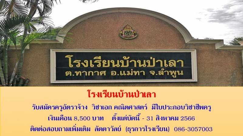 รร.ป่าเลา(ลำพูน) รับสมัครครูคณิตฯ เงินเดือน 8,500.- รับสมัครถึง 31สิงหา66