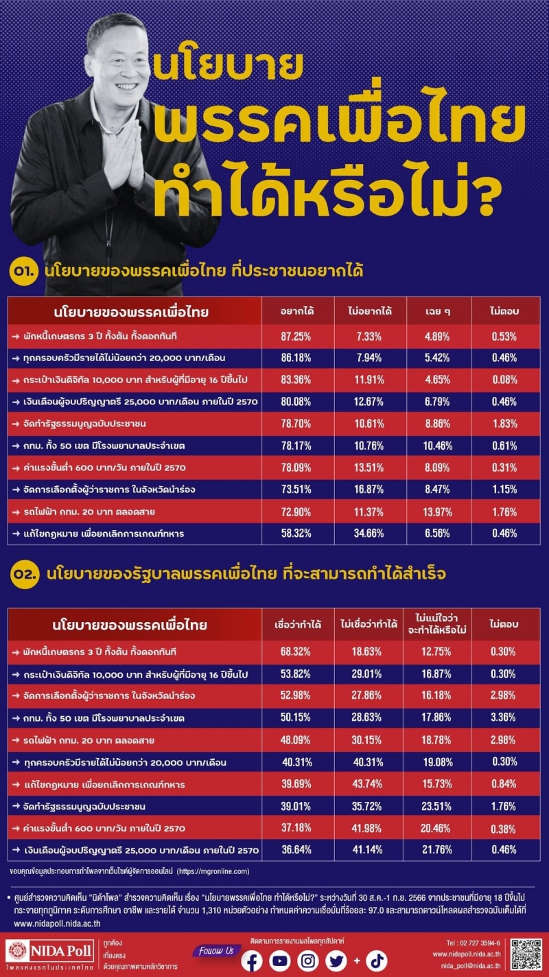 ศูนย์สำรวจความคิดเห็น “นิด้าโพล” สถาบันบัณฑิตพัฒนบริหารศาสตร์ (นิด้า) เปิดเผยผลสำรวจของประชาชน เรื่อง“นโยบายพรรคเพื่อไทย ทำได้หรือไม่?” ทำการสำรวจระหว่างวันที่ 30 สิงหาคม ถึง วันที่ 1 กันยายน 2566 จากประชาชนที่มีอายุ 18 ปีขึ้นไป กระจายทุกภูมิภาค ระดับการศึกษา อาชีพ และรายได้ ทั่วประเทศ รวมทั้งสิ้น จำนวน1,310 หน่วยตัวอย่าง เกี่โดยใช้ความน่าจะเป็นจากบัญชีรายชื่อฐานข้อมูลตัวอย่างหลัก เก็บข้อมูลด้วยวิธีการสัมภาษณ์ทางโทรศัพท์ โดยกำหนดค่าความเชื่อมั่น ร้อยละ 97.0