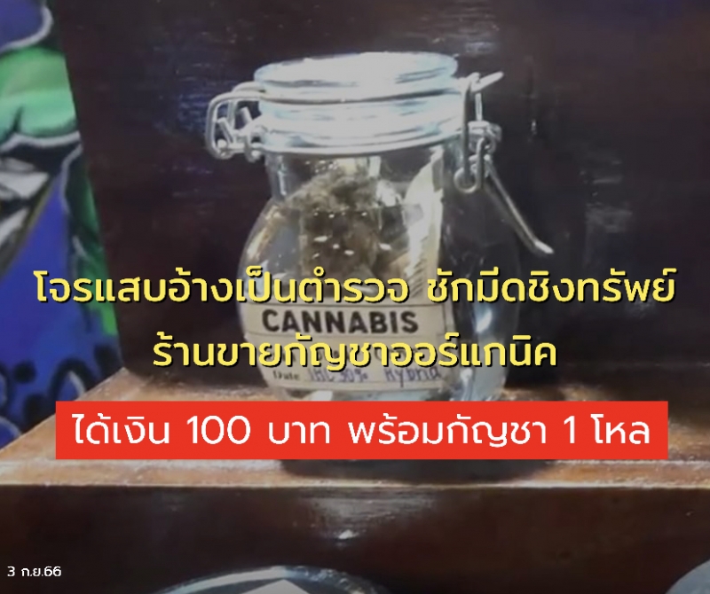 หลังจากนั้นเขาก็ชักมีดปลายแหลมยาวประมาณ 1 ฟุต แล้วบอกว่ามีเงินเท่าไหร่ก็เอามา ตนจึงยื่นเงินให้ไป 100 บาทก่อนที่คนร้ายจะเดินไปหยิบขวดโหลที่บรรจุดอกกัญชาออแกนิคแห้ง เกรดพรีเมี่ยม น้ำหนักประมาณ 5 กรัม ราคา2,250 บาท ไปด้วยอีก 1 โหล ตนเห็นว่าเขามีอาวุธ จึงไม่กล้าขัดขืนหรือต่อสู้ เพราะกลัวได้รับอันตราย ถ้าสู้ก็คงถูกแทงไปแล้ว เมื่อคนร้ายเดินออกไปหน้าร้าน ตนจึงโทรแจ้งตำรวจ ตำรวจรับสายแล้ว แต่ยังไม่กล้าพูดอะไร เพราะเขาหันกลับมามอง พอคนร้ายขับรถจักรยานยนต์ออกไป จึงแจ้งเหตุการณ์ให้เจ้าหน้าที่มาตรวจสอบ และเคยเห็นคนร้ายมาซื้อของที่ร้าน 4 – 5 ครั้ง