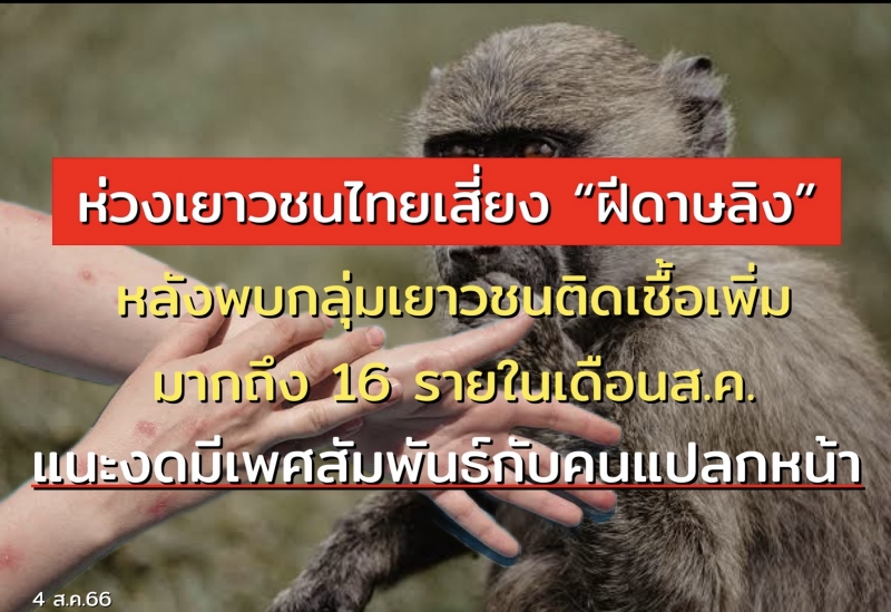 | • ห่วงเยาวชนไทยเสี่ยงติดเชื้อฝีดาษลิง หลังพบกลุ่มเยาวชนติดเชื้อเพิ่มมากถึง 16 รายในเดือนส.ค. แนะ !! งดมีเพศสัมพันธ์ที่ไม่ปลอดภัยกับคนแปลกหน้า |