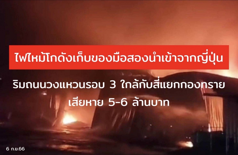 | • ไฟไหม้โกดังเก็บของมือสองนำเข้าจากญี่ปุ่นริมถนนวงแหวนรอบ 3 ใกล้กับสี่แยกกองทราย เสียหาย 5-6 ล้านบาท |