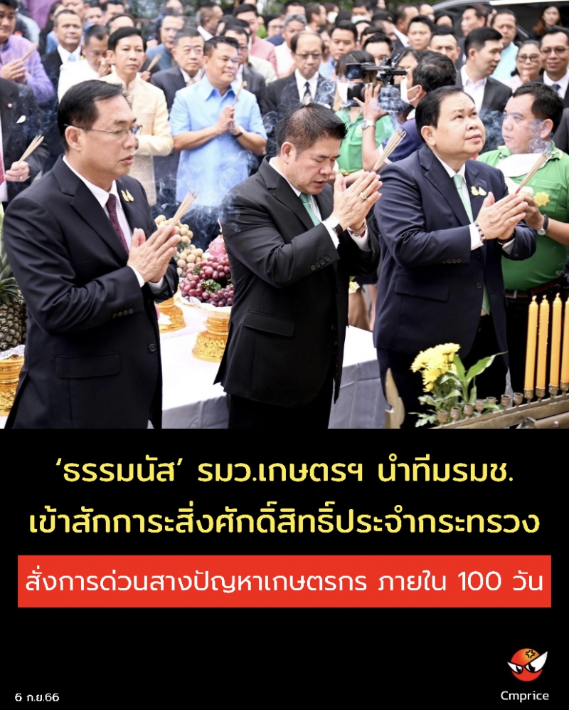 ร้อยเอก ธรรมนัส พรหมเผ่า รัฐมนตรีว่าการกระทรวงเกษตรและสหกรณ์ พร้อมด้วย นายไชยา พรหมา รัฐมนตรีช่วยว่าการกระทรวงเกษตรและสหกรณ์ และนายอนุชา นาคาศัย รัฐมนตรีช่วยว่าการกระทรวงเกษตรและสหกรณ์ เดินทางเข้าสักการะสิ่งศักดิ์สิทธิ์ประจำกระทรวงเกษตรและสหกรณ์ ซึ่งถือฤกษ์ในเวลา 08.09 น. เข้าสักการะห้องพิรุณ 130 (ห้องพระ อาคาร 1 ชั้น 4) สักการะศาลพระภูมิชัยมงคล สักการะศาลท้าวเวสสุวรรณ สักการะศาลตา – ยาย สักการะองค์พระพิรุณทรงนาค (หน้าอาคาร) และสักการะองค์พระพิรุณทรงนาค (ห้องพิพิธภัณฑ์) ก่อนถ่ายภาพร่วมกับผู้บริหาร ข้าราชการ และเจ้าหน้าที่ บริเวณหน้าอาคารกระทรวงเกษตรและสหกรณ์