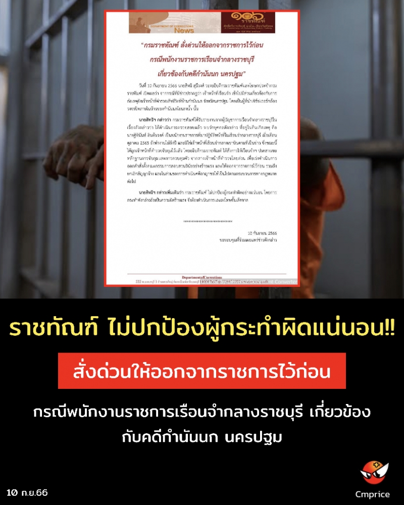 กรมราชทัณฑ์ สั่งด่วนให้ออกจากราชการไว้ก่อน กรณีพนักงานราชการเรือนจำกลางราชบุรี เกี่ยวข้องกับคดีกำนันนกนครปฐม