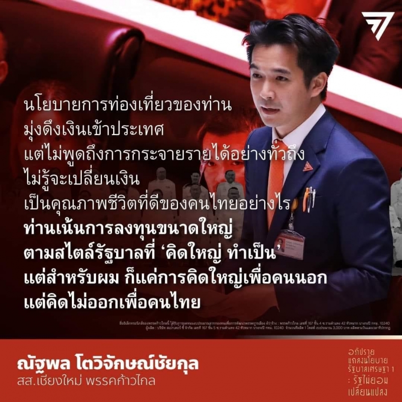 นโยบายของท่านเป็นนโยบายที่เน้นการลงทุนขนาดใหญ่ตามสไตล์ของรัฐบาลที่ ‘คิดใหญ่ ทำเป็น’ แต่สำหรับผมนโยบายการท่องเที่ยวของท่าน ก็แค่การคิดใหญ่เพื่อคนนอก แต่คิดไม่ออกเพื่อคนไทย