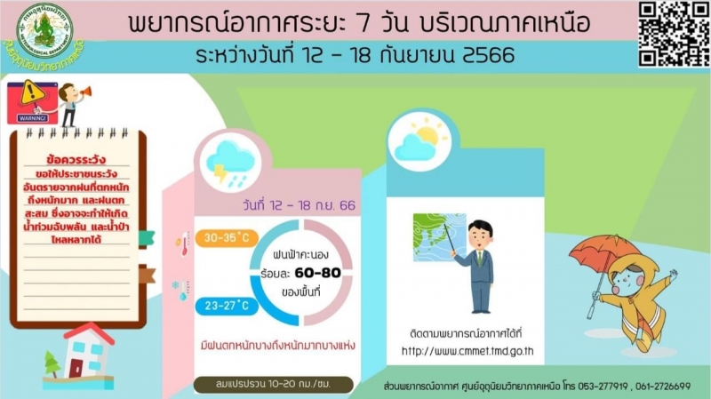 วันนี้ (12 ก.ย. 66) ที่การแถลงข่าวสื่อมวลชนประจำสัปดาห์จังหวัดเชียงใหม่ ห้องประชุม 4 ชั้น 4 อาคารอำนวยการศาลากลางจังหวัดเชียงใหม่ นายรักชัย ศรีนวน นักอุตุนิยมวิทยา ศูนย์อุตุนิยมวิทยาภาคเหนือ แจ้งเตือนสภาพอากาศในห้วงสัปดาห์นี้ มีร่องมรสุมพาดผ่านภาคเหนือตอนบน ประกอบกับมรสุมตะวันตกเฉียงใต้กำลังปานกลางพัดปกคลุมทะเลอันดามัน ทำให้ภาคเหนือมีฝนตกหนักบางพื้นที่ ส่วนในช่วงวันที่ 15 - 17 กันยายน ร่องมรสุมจะเลื่อนลงมาพาดผ่านภาคเหนือ ประกอบกับมรสุมตะวันตกเฉียงใต้ที่พัดปกคลุมทะเลอันดามัน ยังคงมีกำลังปานกลาง ทำให้ภาคเหนือมีฝนเพิ่มขึ้น โดยเฉพาะในวันที่ 15 - 16 กันยายน จะได้รับอิทธิพลจากหย่อมความกดอากาศสูง ที่แผ่ปกคลุมภาคเหนือตอนบน ทำให้ฝนตกหนักถึงหนักมาก ขอให้ประชาชนในพื้นที่เสี่ยงน้ำหลาก ดินโคลนถล่ม เฝ้าระวังและติดตามข่าวสารทางราชการอย่างใกล้ชิด