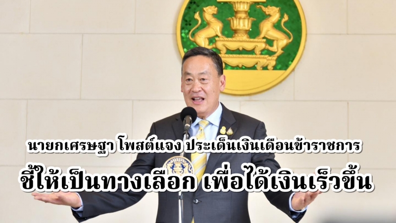 | • นายกเศรษฐา โพสต์แจง ประเด็นเงินเดือนข้าราชการ ชี้ให้เป็นทางเลือก เพื่อได้เงินเร็วขึ้น |