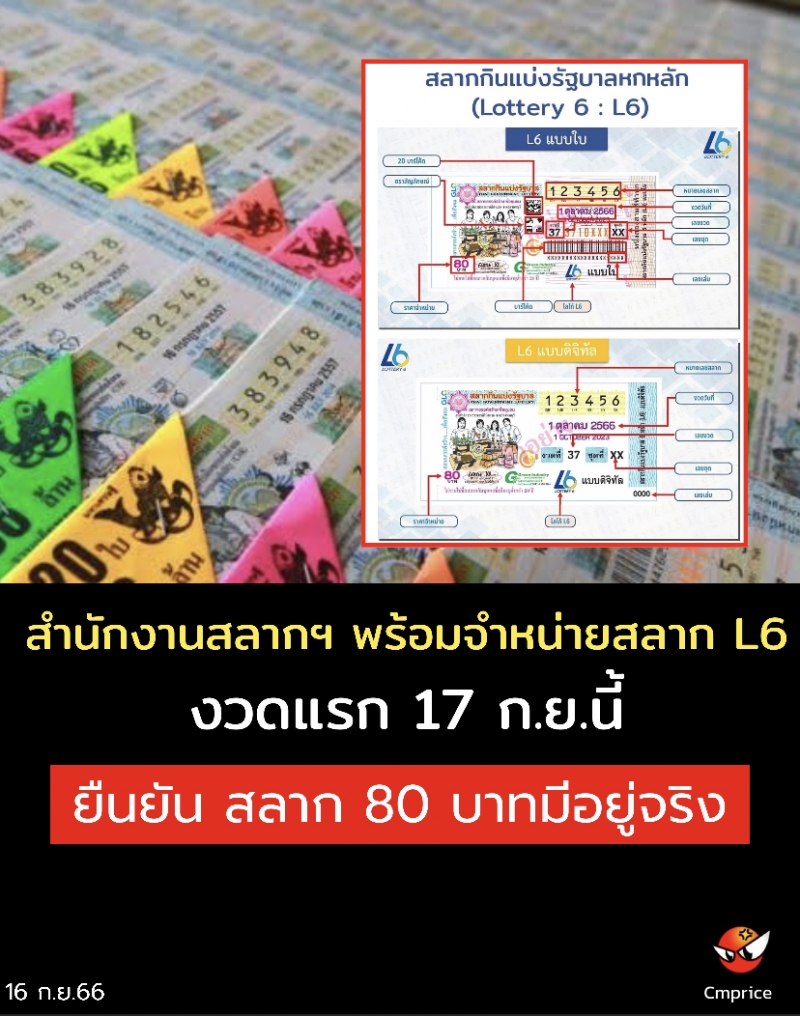 | • สำนักงานสลากฯ พร้อมจำหน่ายสลาก L6 งวดแรก 17 ก.ย.นี้ ยืนยัน สลาก 80 บาทมีอยู่จริง |