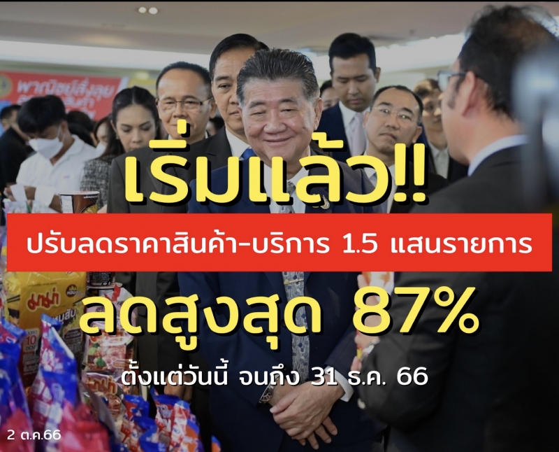 “ภูมิธรรม” ผนึกกำลังผู้ผลิต ผู้จำหน่าย ห้างโมเดิร์นเทรด ห้างท้องถิ่น ผู้ให้บริการ แพลตฟอร์ม รวม 288 ราย ปรับลดราคาสินค้าและบริการพร้อมกันทั้งประเทศรวม 151,676 รายการ แถมใช้โค้ดส่วนลดซื้อสินค้าออนไลน์ได้กว่า 1 ล้านรายการ ลดแรง สูงสุด 87% ดีเดย์ตั้งแต่วันนี้เป็นต้นไป