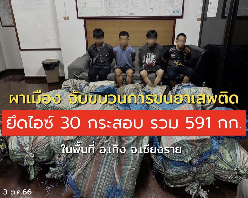 เมื่อวันที่ 1 ตุลาคม 2566 เวลา 2200 กองกำลังผาเมือง โดย ชุดปฏิบัติการข่าวพิเศษ หน่วยเฉพาะกิจกรมทหารพรานที่ 31 จัดกำลังพล 1 ชุดปฏิบัติการ ร่วมกับ นปส.เชียงราย กก.2 บก.ปส.3 ปฏิบัติภารกิจลาดตระเวนเฝ้าตรวจเพื่อป้องกันและสกัดกั้นการกระทำผิดตามพระราชบัญญัติ ประมวลกฎหมายยาเสพติด บริเวณ บ้านม่วงไพรวัลย์ ต.เวียงอ.เทิง จว.ช.ร. ในระหว่างปฏิบัติหน้าที่ได้ตรวจพบรถยนต์ (กระบะ) ยี่ห้อ นิสสัน รุ่น นาวาร่า สีส้ม ทะเบียน ผต 6426 เชียงราย, รถยนต์ (กระบะ) ยี่ห้อ ฟอร์ด รุ่น เรนเจอร์ สีขาว ทะเบียน 2 ฒบ 9325 กรุงเทพมหานคร และรถ จยย. ยี่ห้อฮอนด้า รุ่น เวฟ 110 ไอ สีน้ำเงิน หมายเลขทะเบียน 1 กฬ 9426 เชียงราย ขับขี่ตามกันมา เจ้าหน้าที่จึงได้แสดงตัวเพื่อขอทำการตรวจค้น ผลการปฏิบัติสามารถจับกุมผู้ต้องหา จำนวน 4 ราย (ชาย) ทราบชื่อ นายสุทธิศักดิ์ แซ่ย่าง อายุ22 ปี, นายฉัตรชัย ฉัตรนาถวรกุล อายุ 19 ปี, นายไพรัฐ ศิริวิริยะประเสริฐ อายุ 24 ปี และ นายทินภัทร เขตโรจน์จรัสอายุ 27 ปี พร้อมของกลางยาเสพติดให้โทษประเภท 1 (ไอซ์) จำนวน 30 กระสอบ รวมน้ำหนัก 591 กิโลกรัม บรรทุกอยู่บริเวณท้ายกระบะรถยนต์ ยี่ห้อ นิสสัน รุ่น นาวาร่า สีส้ม ทะเบียน ผต 6426 เชียงราย และโทรศัพท์มือถือ จำนวน 4 เครื่อง