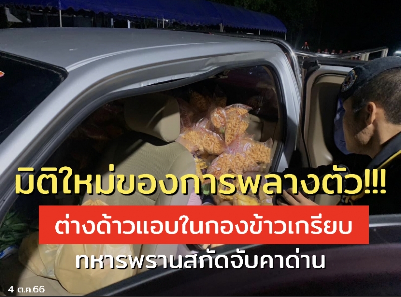 | • มิติใหม่ของการพลางตัว!!! ทหารพรานที่3504 สกัดจับต่างด้าวแอบในกองถุงข้าวเกรียบ คาด่านตรวจ |