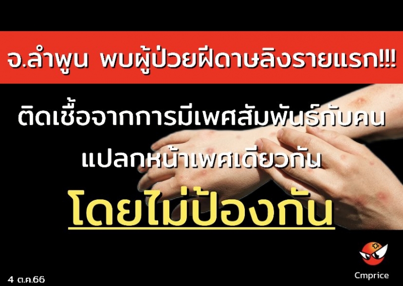 วันนี้ 4 ตุลาคม 2566 เพจ สวท.ลำพูน FM 95 ได้รายงานว่า สำนักงานสาธารณสุขจังหวัดลำพูน รายงานพบผู้ป่วยติดเชื้อฝีดาษวานร ยืนยันรายแรก เป็นชายไทย ติดเชื้อจากการมีเพศสัมพันธ์กับคนแปลกหน้าเพศเดียวกันโดยไม่ป้องกัน อาการที่พบ คือ มีไข้ ปวดเมื่อยกล้ามเนื้อ อวัยวะเพศบวมอักเสบ ต่อมน้ำเหลืองขาหนีบโต มีตุ่มหนองแขน ใบหน้า และอวัยวะเพศ ทั้งนี้ สถานการณ์โดยรวมของประเทศไทย ณ วันที่ 1 ตุลาคม 2566 มีผู้ติดเชื้อแล้วทั้งสิ้น 461 ราย เป็นชาย 446 ราย และเป็นหญิง 15 ราย ซึ่งสถานการณ์ในประเทศไทยมีแนวโน้มพบผู้ติดเชื้อเพิ่มขึ้นอย่างต่อเนื่อง โดยเฉพาะในกลุ่มเสี่ยงที่มีเพศสัมพันธ์ที่ไม่ปลอดภัย และกลุ่มผู้ที่ติดเชื้อเอชไอวีอยู่แล้วจะสามารถแพร่เชื้อต่อได้โดยง่าย