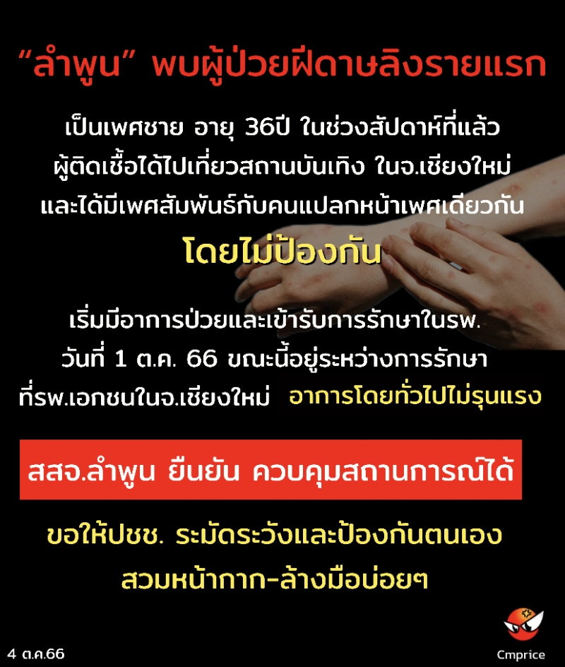 นายแพทย์สุริยพงณช์ สุริยะพงฑากุล นายแพทย์เชี่ยวชาญ ( ด้านเวชกรรมป้องกัน ) รองนายแพทย์สาธารณสุขจังหวัดลำพูน รักษาราชการการแทนนายแพทย์สาธารณสุขจังหวัดลำพูน เปิดเผยถึงสถานการณ์โรคฝีดาษวานรของจังหวัดลำพูน ว่า ในวันที่ 2 ตุลาคม 2566 ที่ผ่านมา สำนักงานสาธารณสุขจังหวัดลำพูนได้รับแจ้งจากสำนักงานสาธารณสุขจังหวัดเชียงใหม่ว่า พบผู้ป่วยโรคฝีดาษวานร เข้ารับการรักษาที่โรงพยาบาลเอกชนแห่งหนึ่งในจ.เชียงใหม่ จำนวน 1 ราย โดยผู้ติดเชื้อมีภูมิลำเนาอยู่จังหวัดลำพูน เป็นเพศชาย อายุ 36 ปี มีประวัติเสี่ยงคือ ในช่วงสัปดาห์ที่แล้วผู้ติดเชื้อได้ไปเที่ยวสถานบันเทิงในจ.เชียงใหม่ และได้มีเพศสัมพันธ์กับเพศเดียวกัน เริ่มมีอาการป่วยและได้เข้ารับการรักษาในรพ.ในวันที่ 1 ตุลาคม 2566 ซึ่งขณะนี้อยู่ระหว่างการรักษาจากโรงพยาบาลเอกชนในจ.เชียงใหม่ อาการโดยทั่วไปไม่รุนแรง