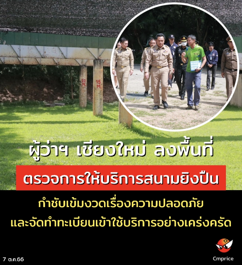 | • ผู้ว่าฯ เชียงใหม่ ลงพื้นที่ตรวจสนามยิงปืน กำชับเข้มงวดเรื่องความปลอดภัย และจัดทำทะเบียนเข้าใช้บริการอย่างเคร่งครัด |