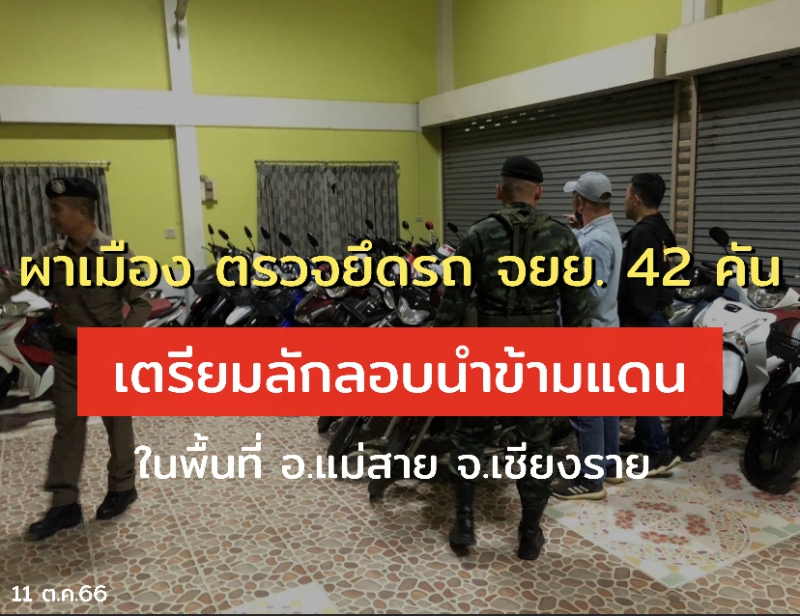 | • กองกำลังผาเมือง ตรวจยึดรถจักรยานยนต์ จำนวน 42 คัน เตรียมลักลอบนำข้ามแดน ในพื้นที่ อ.แม่สาย |