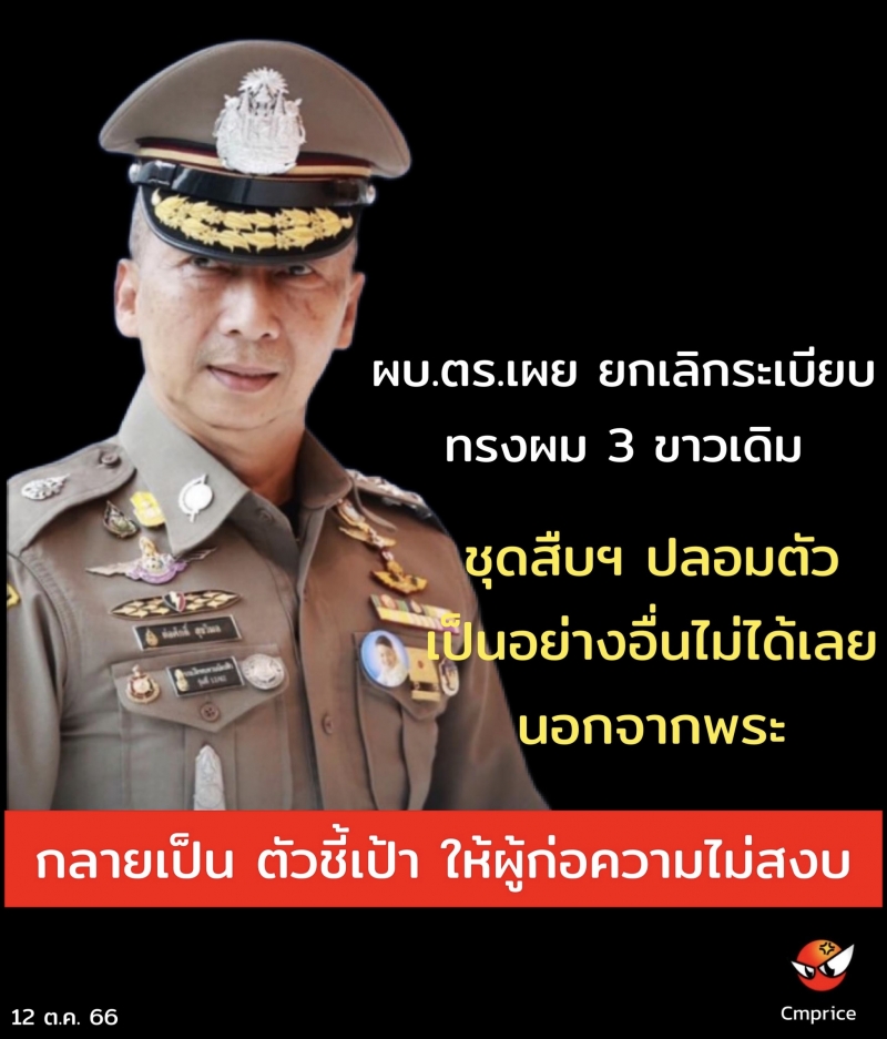 ซึ่งจริงๆ แล้ว สิ่งนี้อยากให้เป็นของขวัญวันสถาปนาสำนักงานตำรวจแห่งชาติ วันที่ 17 ตุลาคมนี้ แต่ไม่อยากให้ประเด็นเรื่องทรงผมเป็นเรื่องที่พิเศษมากหนัก สิ่งที่อยากให้มุ่งคือ เราได้ปรับประยุกต์จากการลงไปสัมผัสปัญหาอุปสรรคของน้องๆ ในพื้นที่ จากนี้ไม่ใช่เพียงการไปตรวจเยี่ยมเท่านั้น แต่ต้องเอาปัญหามาแก้ไข ถือเป็นนโยบายของผู้บังคับบัญชาทุกท่าน