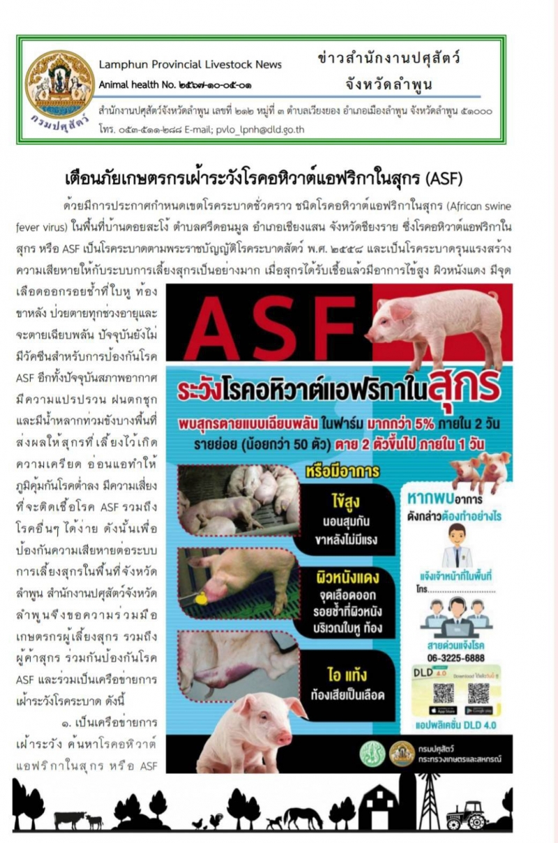 | • ปศุสัตว์ จ.ลำพูน แจ้งเตือนภัยเฝ้าระวังโรคอหิวาต์แอฟริกาในสุกร (ASF) |