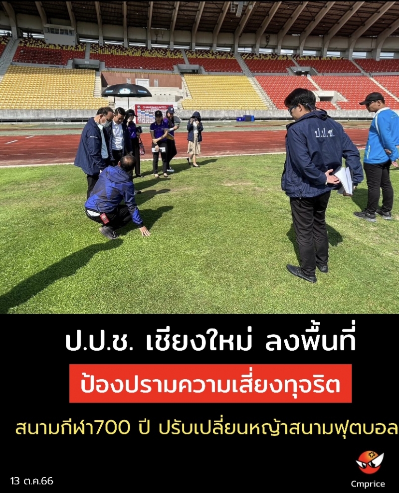 เมื่อวันที่ 12 ตุลาคม 2566 นายนิรันดร ศรีภักดี ผู้อำนวยการสำนักงาน ป.ป.ช. ประจำจังหวัดเชียงใหม่ มอบหมายให้คณะเจ้าหน้าที่กลุ่มงานป้องกันการทุจริต พร้อมด้วยคณะเจ้าหน้าที่จากสำนักงาน ป.ป.ช. ภาค 5 ลงพื้นที่ตามที่ได้รับแจ้งข้อมูลเบาะแสความเสี่ยงการทุจริตจากศูนย์ป้องปรามการทุจริตแห่งชาติ (Corruption Deterrence Center : CDC) กรณี สนามกีฬาสมโภชเชียงใหม่ 700 ปี ใช้งบประมาณ 2.8 ล้านบาท ในการปรับปรุงเปลี่ยนหญ้าสนามฟุตบอลเมนสเตเดียม ที่ใช้เป็นสนามแข่งขันฟุตบอลชิงถ้วยพระราชทาน “คิงส์คัพ” ครั้งที่ 48 แต่สภาพสนามไม่พร้อมจัดแข่งขัน มีหญ้าบางจุดไม่เรียบร้อย บางส่วนขาดหายไป และเป็นหลุมเป็นบ่อซึ่งอาจส่งผลอันตรายต่อนักกีฬาได้