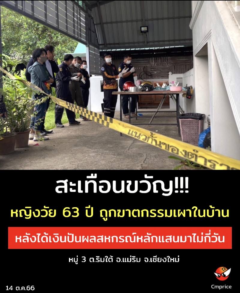 เมื่อวันที่ 14 ตุลาคม 2566 เวลา 13.30 น. ชุดสืบสวน สภ.แม่ริม และ ชุดสืบสวนภธรจังหวัดเชียงใหม่ ร่วมกับเจ้าหน้าที่พิสูจน์หลักฐานและแพทย์เวรโรงพยาบาลนครพิงค์ เข้าตรวจสอบภายในบ้านหมู่ 3 ต.ริมใต้ อ.แม่ริมจ.เชียงใหม่ หลังได้รับแจ้งจากผู้ช่วยผู้ใหญ่บ้านว่าพบศพหญิงวัย 63 ปี เจ้าของบ้าน ถูกฆ่าเผาอย่างโหดเหี้ยมในสวนข้างบ้าน