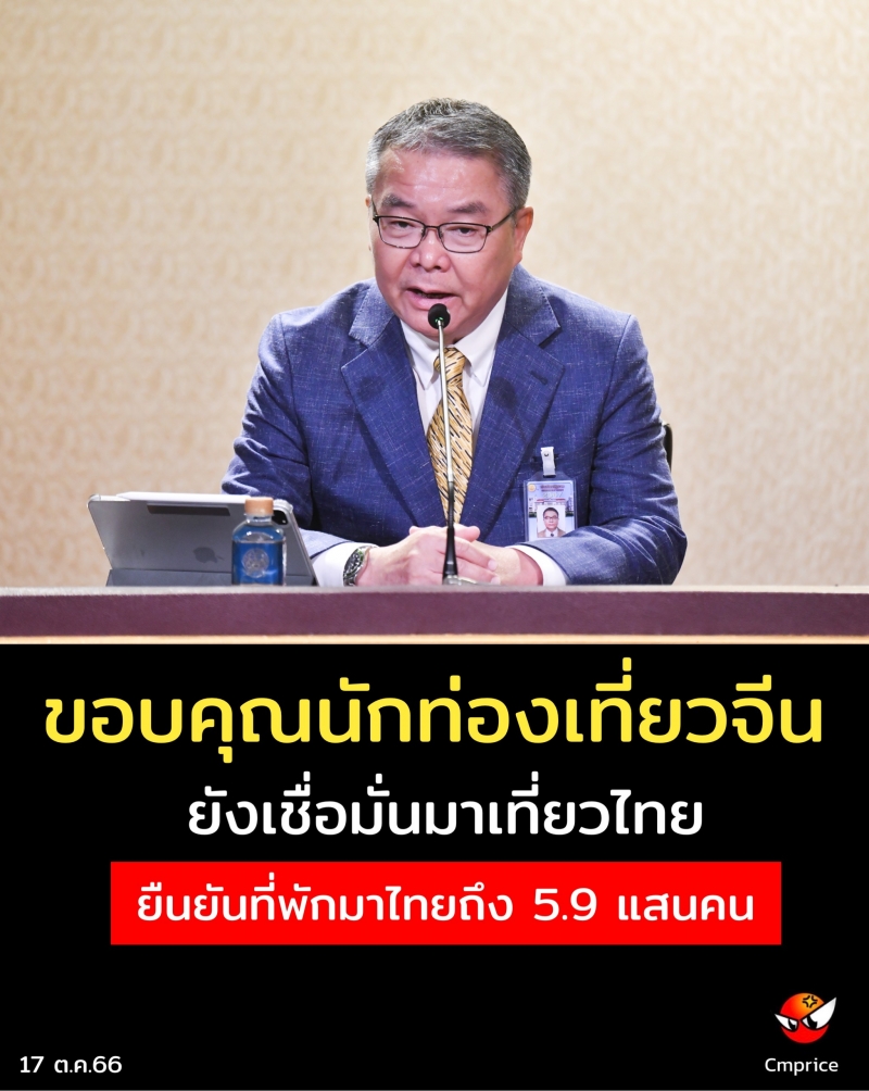 “ขอขอบคุณนักท่องเที่ยวจีนที่เข้าใจประเทศไทย และเชื่อมั่นในรัฐบาลไทย โดยนายเศรษฐา ทวีสิน นายกรัฐมนตรีและรัฐมนตรีว่าการกระทรวงการคลังได้สั่งการกำชับการทำงานให้ทุกหน่วยงานที่เกี่ยวข้อง ดำเนินการตามมาตรการที่ยกมาตรฐานขึ้นอย่างดีที่สุด เพื่อดูแลนักท่องเที่ยว รวมทั้งเพื่อดูแลพี่น้องคนไทยทุกคน” นายสัตวแพทย์ชัย กล่าว