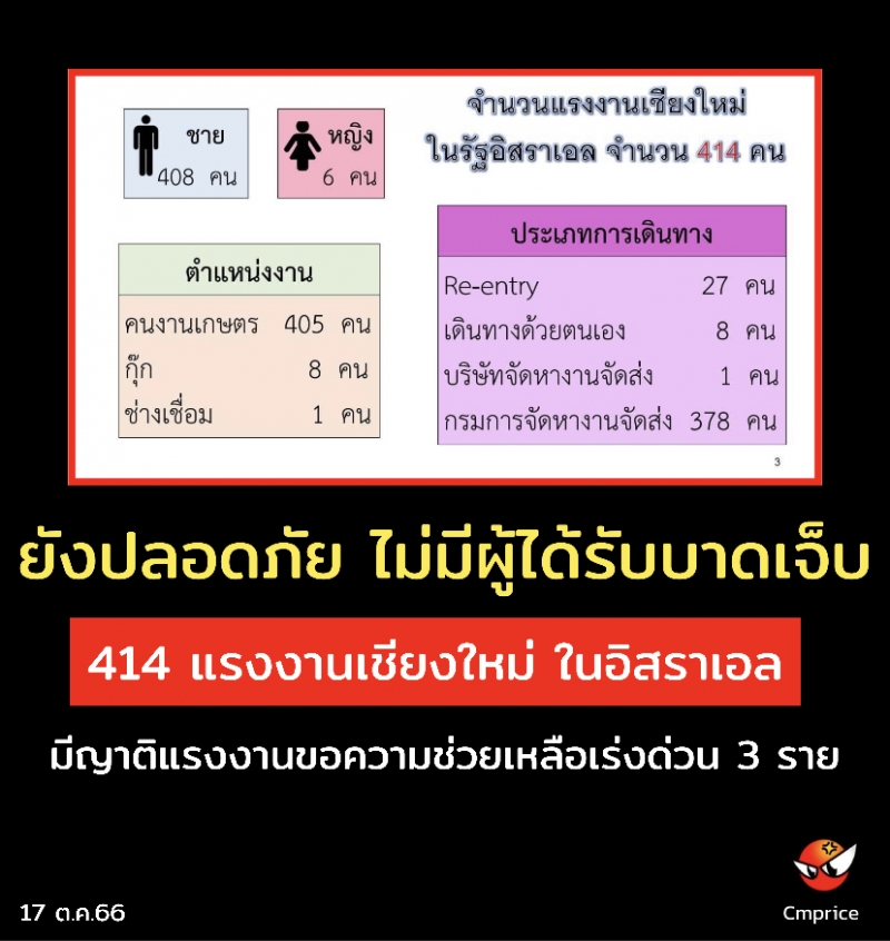 | • 414 แรงงานเชียงใหม่ในอิสราเอลยังปลอดภัย ไม่มีผู้ได้รับบาดเจ็บ/เสียชีวิต |