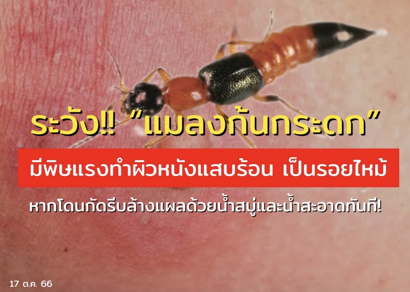 | • ระวัง !! แมลงก้นกระดก มีพิษแรงทำผิวหนังแสบร้อน เป็นรอยไหม้ |