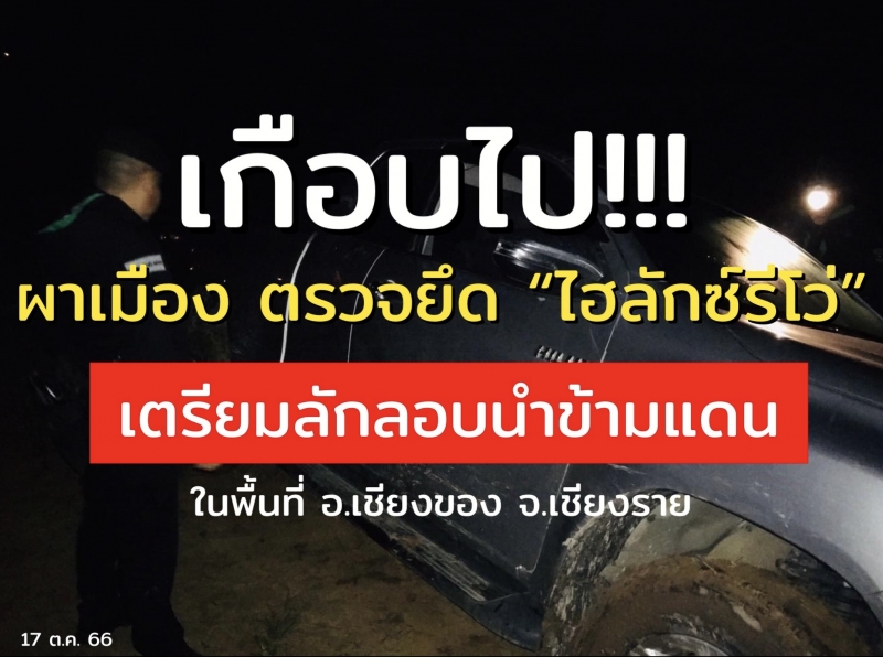 เมื่อวันที่ 17 ตุลาคม 2566 เวลา 0300 กองกำลังผาเมือง โดย กองร้อยทหารพรานที่ 3101 หน่วยเฉพาะกิจทหารพรานที่ 31 จัดกำลังพล จำนวน 1 ชุดปฏิบัติการ ปฏิบัติภารกิจลาดตระเวนเฝ้าตรวจ เพื่อป้องกันและสกัดกั้นการกระทำผิดตามพระราชบัญญัติศุลกากร บริเวณช่องทางธรรมชาติ บ้านดอนมหาวัน หมู่ที่ 9 ต.เวียง อ.เชียงของ จว.ช.ร. หลังจากสืบทราบว่าจะมีการลักลอบนำรถยนต์ออกนอกราชอาณาจักร โดยไม่ผ่านพิธีการทางศุลกากร ในระหว่างปฏิบัติหน้าที่ได้ตรวจกลุ่มบุคคลขับรถยนต์ ยี่ห้อ โตโยต้า รุ่นไฮลักซ์รีโว่ สีเทา ไม่ติดแผ่นป้ายทะเบียน เข้ามาจอดบริเวณพื้นที่เฝ้าตรวจ ลักษณะหันหน้าลงริมตลิ่งแม่น้ำโขง หน่วยจึงได้แสดงตัวเพื่อทำการตรวจสอบ แต่กลุ่มบุคคลดังกล่าวได้วิ่งหลบหนีโดยอาศัยความมืดและความชำนาญพื้นที่หลบหนีไปได้ จากการตรวจสอบภายในรถยนต์ไม่พบยาเสพติดและสิ่งผิดกฎหมาย บริเวณกระจกหน้ารถพบป้ายภาษีระบุหมายเลขทะเบียน บต 2849 สิงห์บุรี ผู้ครอบครองชื่อนาง เดือนฉาย มูเนส อาลี บ้านเลขที่ 64/1 หมู่ที่ 2 ต.หนองสะเดา อ.สามซุก จ.สุพรรณบุรี ผู้ถือกรรมสิทธิ์ บริษัทโตโยต้า ลิสซิ่ง (ประเทศไทย) จำกัด คาดว่ากลุ่มขบวนการลักลอบนำรถยนต์ออกนอกราชอาณาจักร เตรียมนำรถคันดังกล่าวขึ้นเรือและนำไปส่งไปยังประเทศเพื่อนบ้าน หน่วยจึงได้ทำบันทึกตรวจยึดและนำส่งสถานีตำรวจภูธรเชียงของเพื่อดำเนินการตามกฎหมายต่อไป