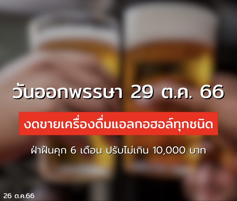 | • งดขายเครื่องดื่มแอลกอฮอล์ทุกชนิดวันออกพรรษา 29 ต.ค. 66 ฝ่าฝืนคุก 6 เดือน ปรับไม่เกิน 10,000 บาท หรือทั้งจำทั้งปรับ |