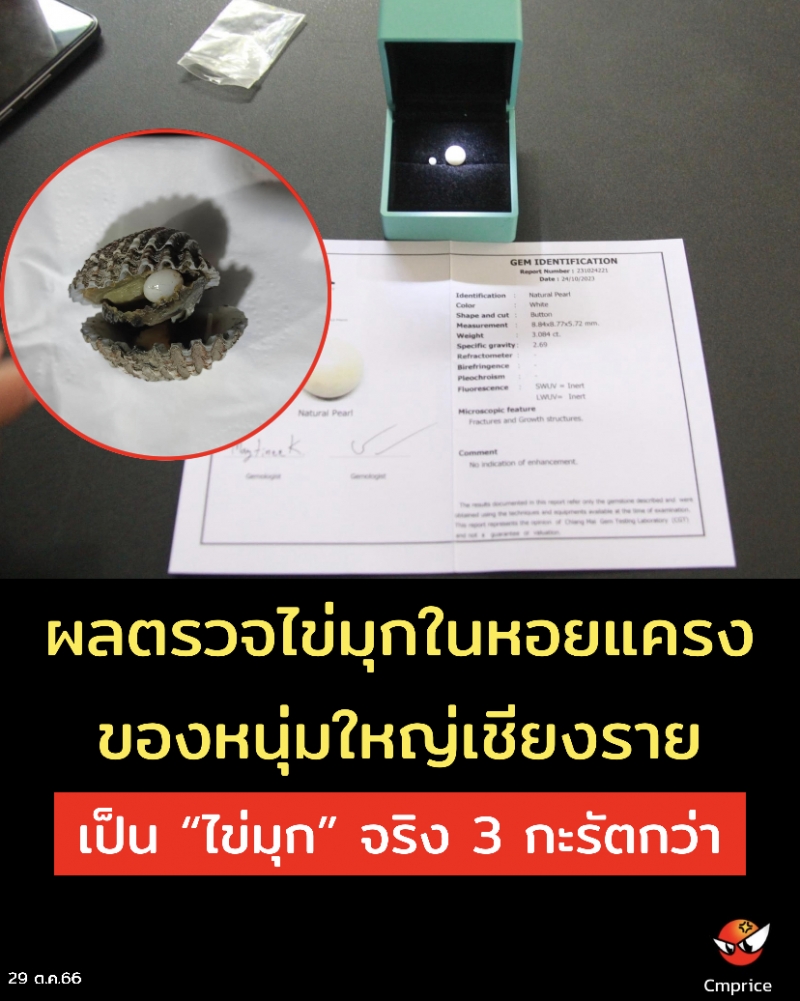 29 ต.ค.66- ประชาสัมพันธ์จังหวัดเชียงราย แจ้งหลังจากที่ได้นำเสนอข่าวการพบเจอไข่มุกในหอยแครงขนาด 1 ซม. ของ นายเศรษฐพงศ์ ศิววงศ์ร อายุ 45 ปี หรือที่เรียกกันว่า “ประธานเดี่ยว” ทราบภายหลังว่ามีตำแหน่งเป็นรองประธานสโมสรกีฬาราชประชา อยู่บ้านเลขที่ 5 หมู่ 4 ตำบลบัวสลี อำเภอแม่ลาว จังหวัดเชียงราย โดยเจ้าตัวได้ออกมาเปิดเผยอีกครั้งเกี่ยวกับการพบเจอไข่มุกในหอยแครงเมื่อหลายอาทิตย์ก่อนหน้านี้ ซึ่งได้นำไข่มุกดังกล่าวส่งตรวจพิสูจน์ที่สถาบัน (CGT) หรือ (Chiangmai Gem Testing Laboratory : CGT LAB) จังหวัดเชียงใหม่ ซึ่งเป็นสถาบันตรวจอัญมณีวิทยา ผลการตรวจเป็นไข่มุกจริงที่เกิดจากธรรมชาติ เป็นไข่มุกประเภทสีขาวแวววาวสะท้อนแสงอย่างเห็นได้ชัด มีขนาดเท่ากับ 3.084 กะรัต ทางสถาบัน CGT ได้ออกเอกสารรับรองว่าเป็นไข่มุกจริงมาแล้ว หากนับเป็นมูลค่าแล้วเจ้าตัวบอกว่านับเป็นมูลค่าไม่ได้ และจะไม่ขาย หรือจำหน่ายโดยเด็ดขาด จะเก็บไว้เพื่อเป็นสิริมงคลแก่ตัวเองและครอบครัว เพราะหาได้ยากที่เกิดขึ้นในหอยแครง เบื้องต้นจะนำไข่มุกดังกล่าวไปทำเป็นจี้หรือใส่เป็นหัวแหวนแต่คิดว่าจะทำเป็นหัวแหวนมากกว่า และจะให้ช่างหรือผู้ที่ชำนาญทำกรอบเครือบไว้เพื่อป้องกันไม่ให้ไข่มุกเกิดรอยแตกร้าวเสียหาย ต่อไป