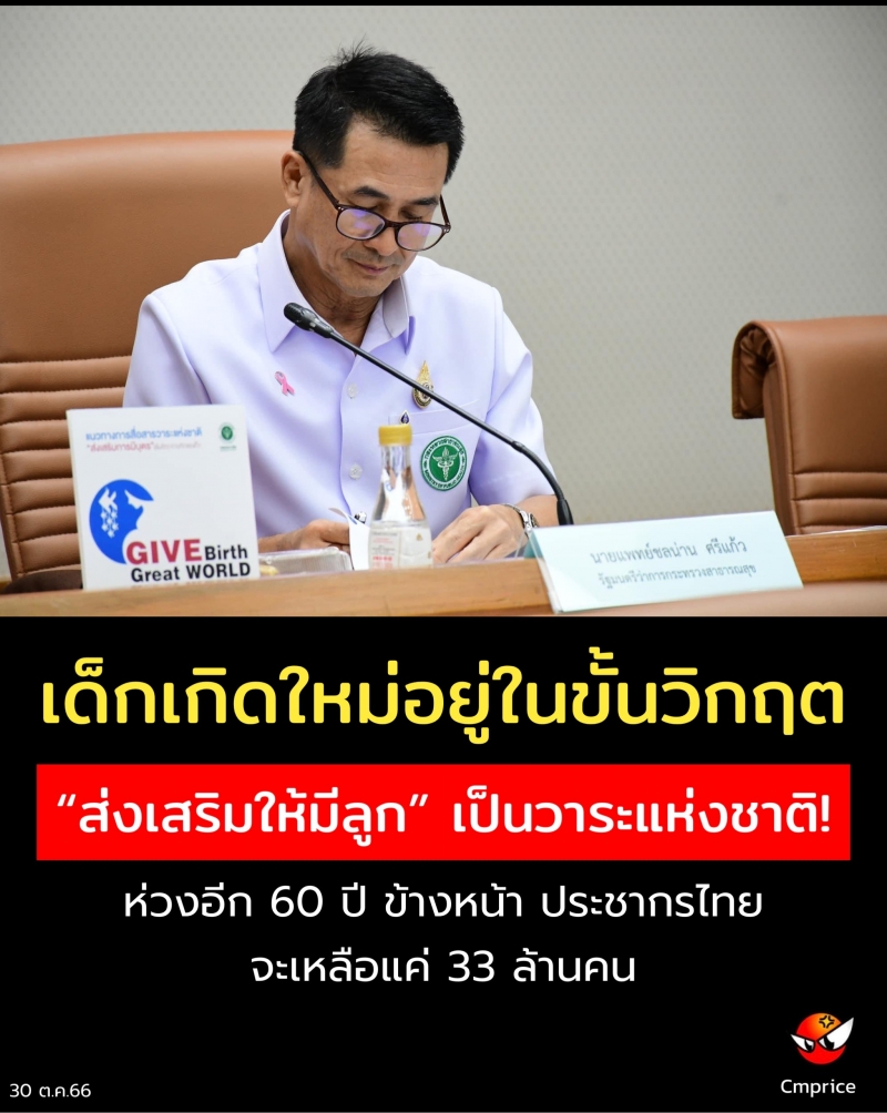 30 ต.ค.66-นพ.ชลน่าน ศรีแก้ว รมว.สธ. เผยว่า การลดลงของเด็กเกิดใหม่ในไทยอยู่ในขั้นวิกฤตจากเดิมมีเด็กเกิดไม่ต่ำกว่าปีละ 1 ล้านคน ในช่วงปี 2506 - 2526 “ปี 2564 ลดลง มีเด็กเกิดแค่ 485,085 คน