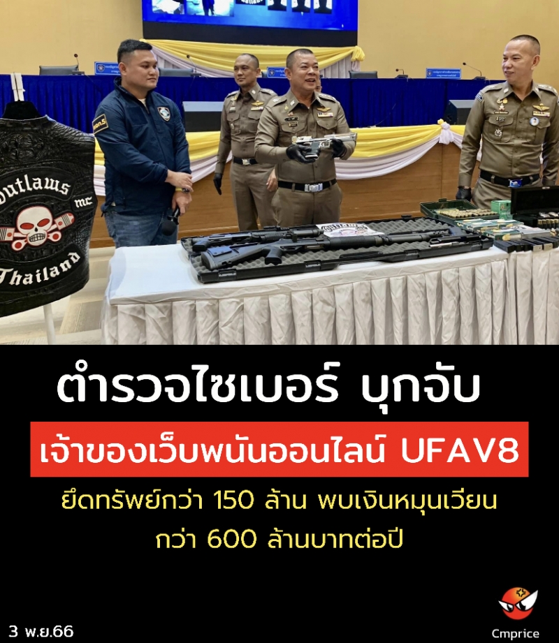 เมื่อวันนี้ 2 พ.ย.66 เวลา 16.30 น. ที่อาคารสัมมนาและฝึกอบรม ตร. (เมืองทองธานี) บช.สอท. นำโดย พล.ต.ท.ธนาชูวงศ์ รรท.รอง ผบ.ตร. พล.ต.ท.วรวัฒน์ วัฒน์นครบัญชา ผบช.สอท. พล.ต.ต.จิระวัฒน์ พยุงธรรม รรท.รอง ผบช.สอท. และ พล.ต.ต.ณัฐกร ประภายนต์ รรท.ผบก.ตม.3 พร้อมเจ้าหน้าที่ที่เกี่ยวข้อง ร่วมกันแถลงผลการปฏิบัติกรณีบุกจับกุมเจ้าของเว็บพนันออนไลน์ UFAV8 พบเป็นประธานกลุ่ม “OUTLAWS MC THAILAND” ตรวจยึดทรัพย์สินที่เกี่ยวข้องกว่า 150 ล้านบาท และมีเงินหมุนเวียนกว่า 600 ล้านบาทต่อปี