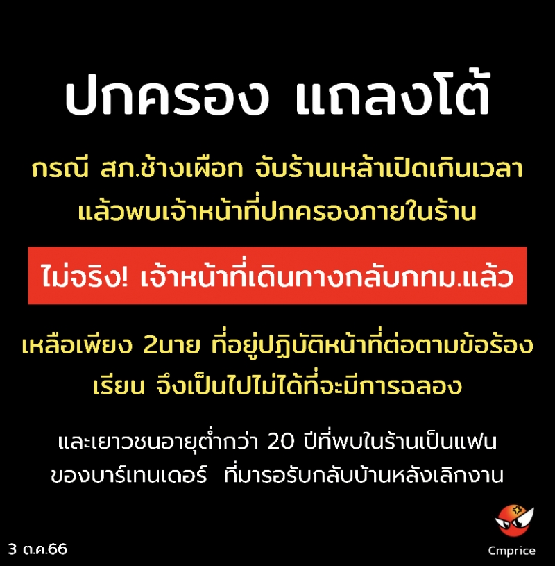 | • ปกครองแถลงโต้ หลัง ตร.ช้างเผือก บุกจับร้านเหล้าเปิดขายเกินเวลา แล้วเจอชุดสืบของปกครองในร้าน |