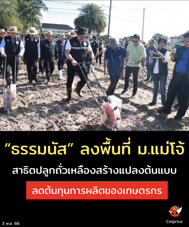บ่ายวันนี้ (3 พ.ย. 66) ร้อยเอก ธรรมนัส พรหมเผ่า รัฐมนตรีว่าการกระทรวงเกษตรและสหกรณ์ พร้อมด้วยคณะผู้บริหารกระทรวงเกษตรและสหกรณ์ ลงพื้นที่พบปะคณะผู้บริหารมหาวิทยาลัยแม่โจ้รับฟังความรู้การปลูกถั่วเหลืองและสาธิตการปลูกถั่วเหลืองด้วยเทคโนโลยีและนวัตกรรม ที่แปลงสาธิตเกษตรทฤษฎีใหม่ตามแนวพระราชดำริ มหาวิทยาลัยแม่โจ้ เพื่อให้เป็นแปลงต้นแบบการปลูกถั่วเหลือง ซึ่งเป็นกิจกรรมสำคัญของงาน “นวัตกรรมเสริมแกร่งถั่วเหลืองไทย เพิ่มรายได้เกษตรกร” ที่ทางกระทรวงเกษตรและสหกรณ์จัดขึ้นเพื่อส่งเสริมให้เกษตรกรใช้เทคโนโลยีและนวัตกรรมทางด้านการเกษตร ช่วยเพิ่มผลผลิตและรายได้ให้กับเกษตรกร โดยมี นายชัชวาลย์ ปัญญา รองผู้ว่าราชการจังหวัดเชียงใหม่ พร้อม ส่วนราชการที่เกี่ยวข้อง และกลุ่มเกษตรกร ร่วมให้การต้อนรับ
