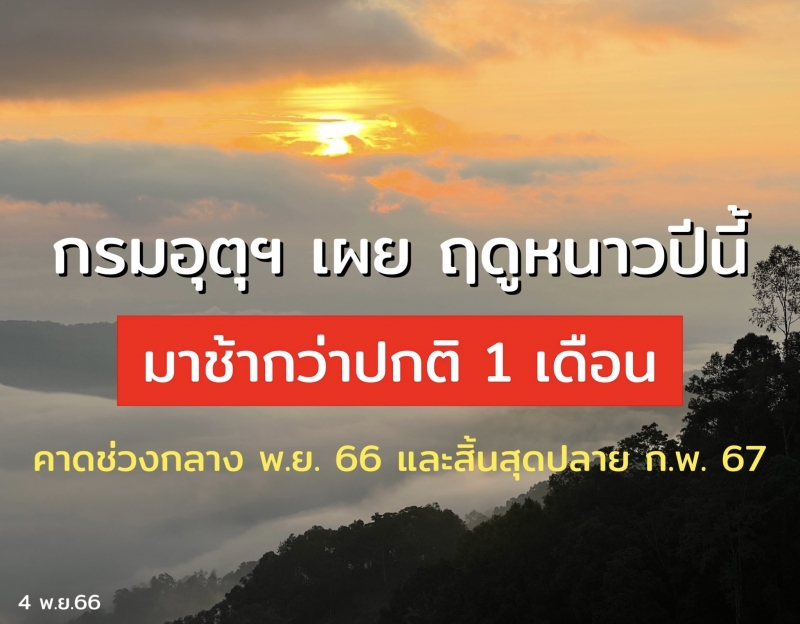 | • กรมอุตุฯ เผย ฤดูหนาวปีนี้มาช้ากว่าปกติ 1 เดือน คาดช่วงกลาง พ.ย. 66 และจะสิ้นสุดปลาย ก.พ. 67 |