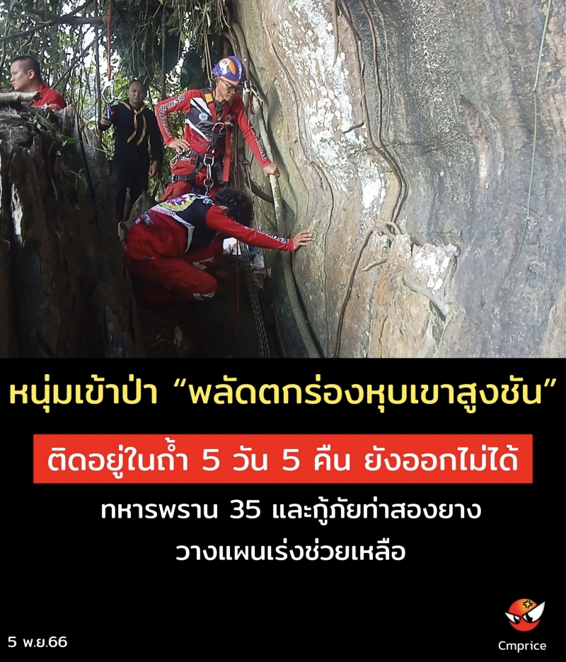 | • หนุ่มเข้าป่า พลัดตกร่องหุบเขาสูงชัน ติดอยู่ในถ้ำ 5 วัน 5 คืน ยังออกไม่ได้ ทหารพราน 35 และกู้ภัยท่าสองยาง วางแผนเร่งช่วยเหลือ |