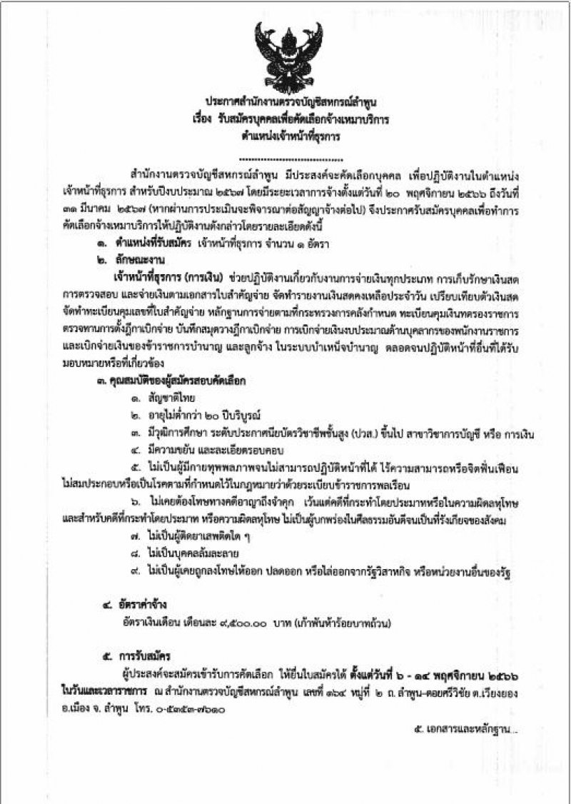 สำนักงานตรวจบัญชีสหกรณ์ลำพูน รับสมัครบุคคลเพื่อเข้ารับการจ้างเหมาบริการตำแหน่ง เจ้าหน้าที่ธุรการ  (การเงิน) จำนวน 1 อัตรา
