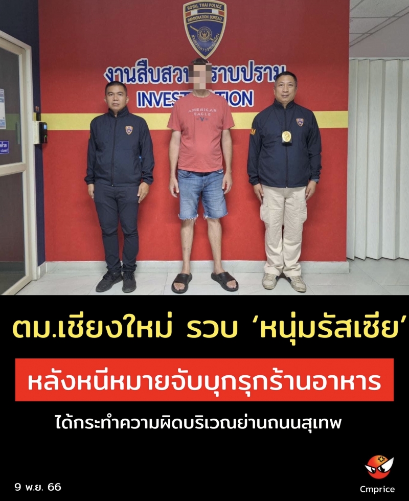 เมื่อวันที่ 3 พฤศจิกายน 2566 เจ้าหน้าที่ชุดสืบสวน ตม.จว.เชียงใหม่ บูรณาการร่วมกับ กก.สส.บก.ตม.5 ได้สืบทราบว่ามีผู้ต้องหาชาวรัสเซีย ซึ่งมีหมายจับข้อหา “เข้าไปในอสังหาริมทรัพย์ของผู้อื่น เพื่อถือการครอบครองอสังหาริมทรัพย์นั้นทั้งหมดหรือแต่บางส่วน หรือเข้าไปกระทำการใดๆ อันเป็นการรบกวนการครอบครองอสังหาริมทรัพย์ของเขาโดยปกติสุข และทำให้เสียหาย ทำลาย ทำให้เสื่อมค่าหรือทำให้ไร้ประโยชน์ซึ่งทรัพย์ของผู้อื่นหรือผู้อื่นเป็นเจ้าของรวมอยู่ด้วย” ได้มาปรากฏตัวอยู่ที่บริเวณถนนนิมมานเหมินทร์ จึงได้ลงพื้นที่สืบสวนหาข่าวเพิ่มเติม และวางแผนติดตาม จนพบตัวและสามารถจับกุมตัวผู้ต้องหารายดังกล่าวได้ในวันที่ 8 พฤศจิกายน 2566 โดยชาวรัสเซียรายดังกล่าว ได้ขออยู่ต่อในราชอาณาจักรด้วยเหตุผลเป็นคนอยู่ชั่วคราว และได้กระทำความผิดบริเวณย่านถนนสุเทพ จึงจับกุมตัวส่งพนักงานสอบสวน สภ.ภูพิงคราชนิเวศน์ เพื่อดำเนินคดีตามกฎหมายต่อไป