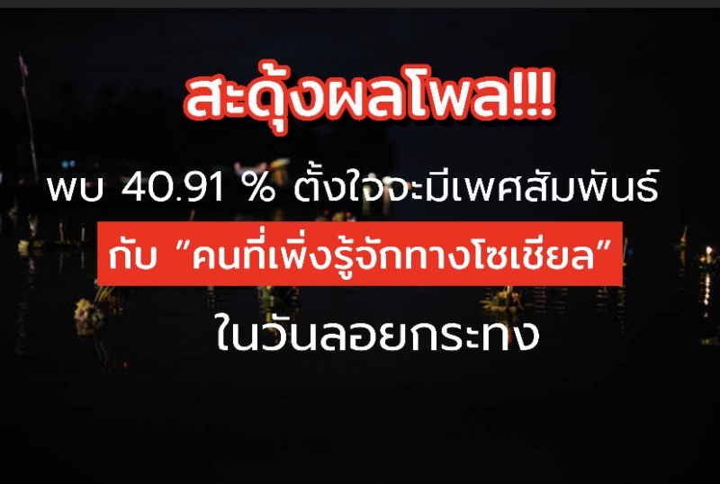| • ผลโพล พบตัวเลขน่าสะดุ้ง!!! กว่า 40% ตั้งใจจะมีเพศสัมพันธ์กับคนที่เพิ่งรู้จักทางโซเชียลในวันลอยกระทง |