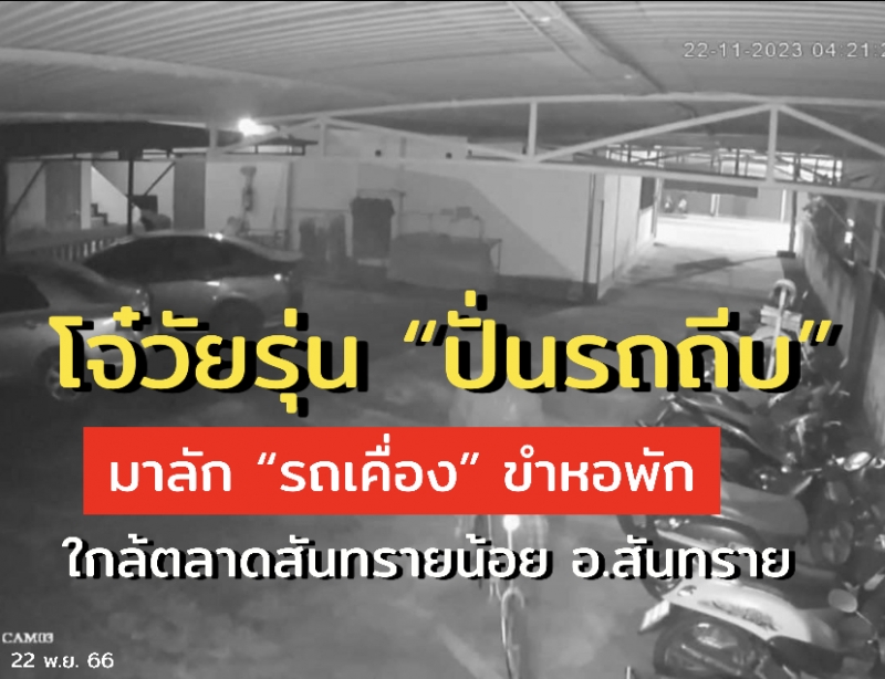 วันที่ 22 พ.ย.2566 เวลา 04.21 น. กล้องวงจรปิดบันทึกภาพใบหน้าของคนร้ายวัยรุ่นคนหนึ่ง ได้ปั่นจักรยานเข้ามาในที่จอดรถของหอพักใกล้ตลาดสันทรายน้อย อ.สันทราย จ.เชียงใหม่ โดยทิ้งจักรยานไว้ แล้วขโมยรถจักรยานยนต์ฮอนด้าดรีม สีฟ้า ทะเบียน กล 7164 เชีงงใหม่ ขับหลบหนีไป