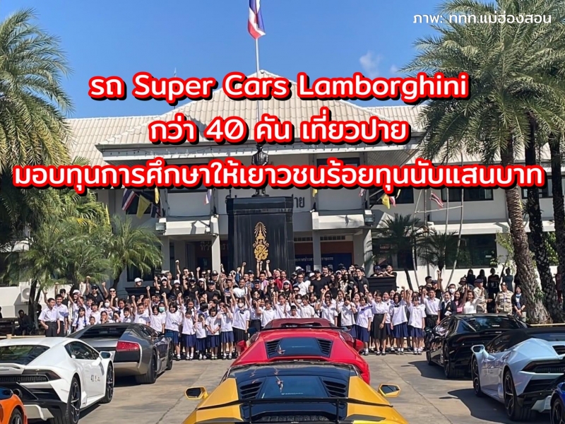 เมื่อวันที่ 24-25 พฤศจิกายน 2566 กลุ่ม Lamborghini Bangkok และ บริษัท Renazzo Motor จำกัด ได้นำคณะนักท่องเที่ยวกลุ่มรถซูเปอร์คาร์แลมโบกินี และทีมงาน จำนวนกว่า 100 คน เดินทางมาท่องเที่ยวเส้นทางเชียงใหม่ - อ.ปาย จ.แม่ฮ่องสอน โดยมีนักท่องเที่ยวในคณะเดินทางโดยรถซูเปอร์คาร์แลมโบกินี รุ่นต่าง ๆ หลากสีสัน จำนวน40 คัน ซึ่งช่วยเพิ่มสีสันของการท่องเที่ยวอำเภอปายท่ามกลางอากาศที่เริ่มหนาวเย็น ซึ่งในคณะมียูทูปเบอร์ชื่อดังและศิลปินดารามาร่วมในคณะด้วย อาทิ Sprite Patrick Bank พีเค และโยเกิร์ต โดยมีทีมงานการท่องเที่ยวแห่งประเทศไทย (ททท.) สำนักงานแม่ฮ่องสอน รวมทั้งหน่วยงานและผู้เกี่ยวข้อง ได้แก่ ที่ทำการปกครองอำเภอปาย สถานีตำรวจท่องเที่ยวแม่ฮ่องสอน สถานีตำรวจภูธรปาย สภาวัฒนธรรมอำเภอปาย สมาคมธุรกิจท่องเที่ยวปาย ร่วมให้การต้อนรับ และอำนวยการด้านความปลอดภัยแก่ผู้ใช้รถใช้ถนนตลอดเส้นทาง ตั้งแต่เดินทางเข้าสู่พื้นที่ ร่วมทำกิจกรรมสร้างประโยชน์ให้สังคม ตลอดจนเดินกลับไปยังจังหวัดเชียงใหม่อย่างปลอดภัย เป็นไปตามแผนงานที่ได้มีการประชุมเตรียมการร่วมกันไว้ล่วงหน้า