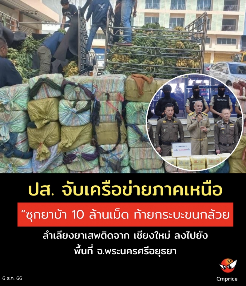 สืบเนื่องจากเมื่อวันที่ 26 พ.ย.66 บช.ปส. โดย กก.2 บก.ปส.3 และ บก.ขส.พร้อมด้วยเจ้าหน้าที่ นปส.ขกท.ศปก.ทบ.(ขกท.ศปก.นสศ.) ได้ร่วมกันสืบสวนติดตามพฤติกรรมเครือข่ายลำเลียงยาเสพติดจากภาคเหนือ พบว่าจะใช้รถกระบะลักษณะตีคอก ก 13XX (ป้ายแดง) กำแพงเพชร และ รถกระบะอีซูซุ ยX 81XX เชียงใหม่ ลำเลียงยาเสพติดจากจว.เชียงใหม่ ลงไปยังพื้นที่ จว.พระนครศรีอยุธยา โดยอำพรางด้วยพืชผลทางการเกษตร ต่อมาได้พบความเคลื่อนไหวของเครือข่ายขับรถกระบะ ก 13XX (ป้ายแดง) กำแพงเพชร เข้าไปรับ ยาเสพติดบริเวณ ต.แม่นะอ.เชียงดาว จว.เชียงใหม่ จากนั้นได้มุ่งหน้าสู่พื้นที่ภาคกลาง โดยมีรถยนต์อีซูซุ ยX 81XX  เชียงใหม่ ขับนำทางและนำมาจอดทิ้งไว้ที่บริเวณหน้าปั๊มน้ำมัน ปตท.วังน้อย จว.พระนครศรีอยุธยา จากนั้นมี รถเก๋งฮอนด้า ญX 28XX กรุงเทพ ขับรถมาจอดที่หน้ารถกระบะ ก 13XX(ป้ายแดง) กำแพงเพชร แล้วมีคนลง จากรถเก๋งแล้วขึ้นไปขับรถกระบะลักษณะตีคอกฯออกไป โดยมีรถเก๋งขับนำทางไป ต่อมาพบรถกระบะ ก 13XX (ป้ายแดง) กำแพงเพชร ขับมาจอดภายในซอยหมู่บ้านฉัตรนคร แขวง/เขตประเวศ กรุงเทพฯ ตำรวจชุดจับกุมจึงแสดงตัวขอตรวจค้น จากการตรวจค้นรถกระบะลักษณะตีคอก พบมีการใช้กล้วยน้ำว้าจำนวนมาก มาวางปิดทับซุกซ่อนกระสอบบรรจุยาบ้า  จำนวนประมาณ10 ล้านเม็ด จึงจับกุมผู้ต้องหาซึ่งทำหน้าที่ขับรถบรรทุกยาเสพติด และรถนำทั้งหมด จำนวน  5 คน พร้อมรถยนต์ 3 คันส่งพนักงานสอบสวนดำเนินคดี