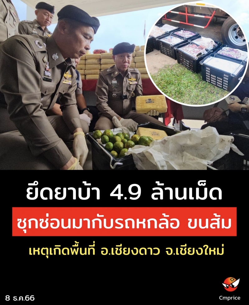 การตรวจยึดยาบ้า 4,900,000 เม็ด ซุกซ่อนมากับพืชผลทางการเกษตร (ส้ม) เหตุเกิดพื้นที่ อ.เชียงดาว จ.เชียงใหม่