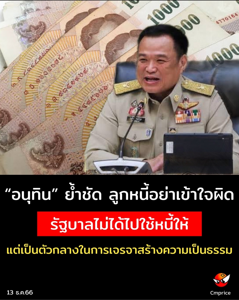 | • อนุทิน ย้ำชัด ลูกหนี้อย่าเข้าใจผิด รัฐบาลไม่ได้ไปใช้หนี้ให้ แต่เป็นตัวกลางในการเจรจาสร้างความเป็นธรรม |