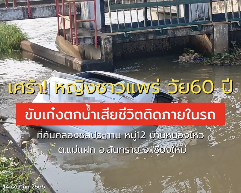 วันที่14 ธ.ค.2566 เวลา 07.30 น. ทางเจ้าหน้าที่ตำรวจ สภ.แม่แฝก รับแจ้งเหตุมีชาวบ้านไปพบรถยนต์เก๋งยี่ห้อโตโยต้า วีออส สีขาว ทะเบียน ขท 48xxเชียงใหม่ ลอยมมาติดประตูปิดน้ำ คันคลองชลประทาน หมู่12 บ้านหนองไหวต.แม่แฝก อ.สันทราย จ.เชียงใหม่ มีคนขับติดอยู่ภายในรถ จึงรุดไปที่เกิดเหตุพร้อมกู้ภัยแม่โจ้ และกู้ชีพใกล้เคียง
