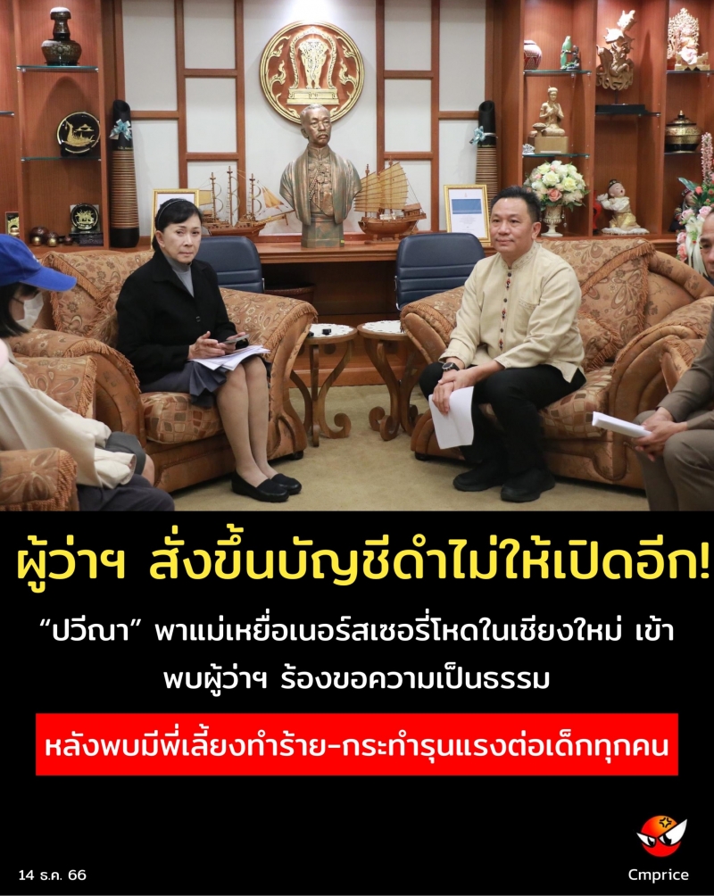 วันนี้ (14 ธ.ค. 66) นางปวีณา หงสกุล ประธานมูลนิธิปวีณาเพื่อเด็กและสตรี พร้อมแม่ของเหยื่อเนอร์สเซอรี่ที่ถูกพี่เลี้ยงทำร้ายร่างกาย เดินทางมายังอาคารอำนวยการ ศาลากลางจังหวัดเชียงใหม่ เข้าพบนายนิรัตน์ พงษ์สิทธิถาวร ผู้ว่าราชการจังหวัดเชียงใหม่ เพื่อร้องทุกข์และขอให้ติดตามเร่งรัดคดีและให้ความช่วยเหลือเด็กให้ถึงที่สุด โดยเหตุการณ์ดังกล่าวได้เกิดขึ้นเมื่อต้นเดือนตุลาคมที่ผ่านมา โดยนางสาวแวว (นามสมมติ) อายุ 39 ปี ได้เข้าร้องทุกข์กับมูลนิธิปวีณาหงสกุลเพื่อเด็กและสตรีว่า ลูกชายวัย 2 ขวบของตนถูกพี่เลี้ยงเนอร์สเซอรี่แห่งหนึ่งในตำบลฟ้าฮ่ามอ.เมืองเชียงใหม่ จังหวัดเชียงใหม่ ทำร้ายร่างกายด้วยการตบหัวอย่างแรงบ่อยครั้ง ตลอด 1 เดือนที่ผ่านมา